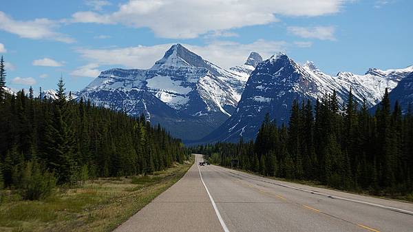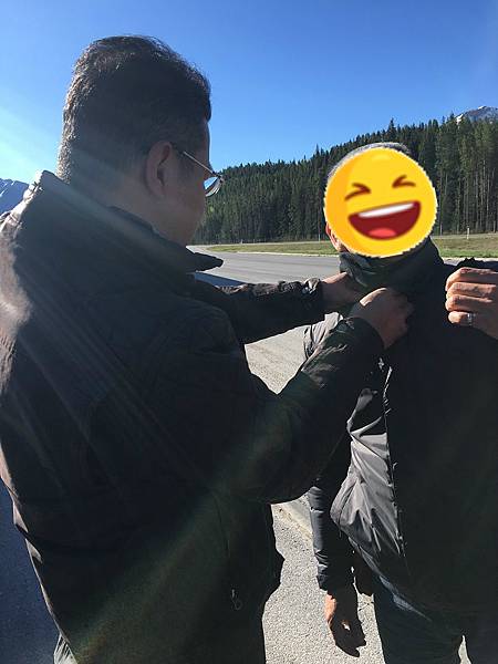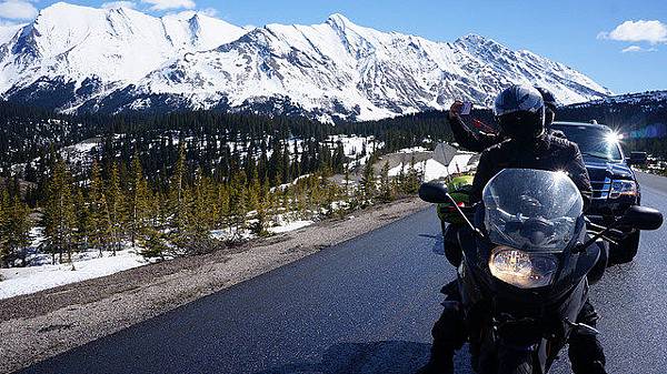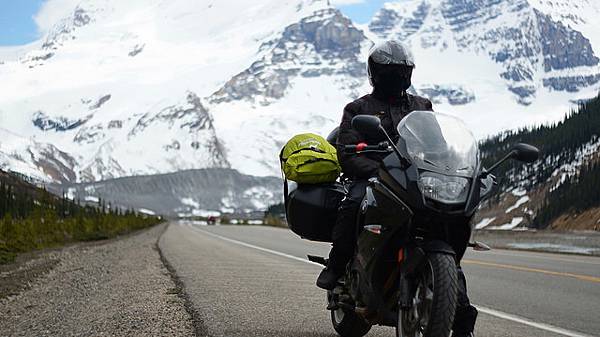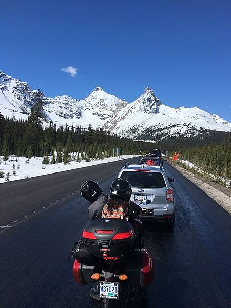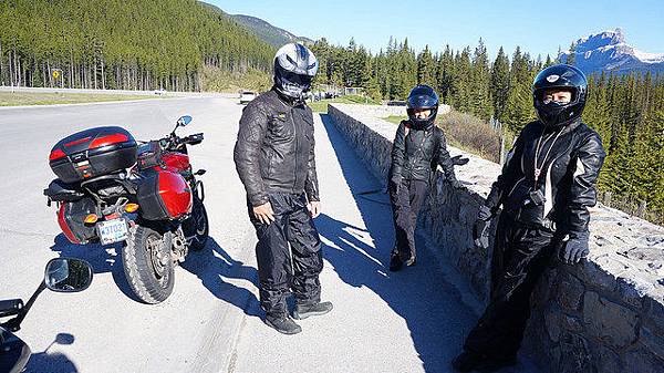 考量不知為何近期上google map所計算的時程顯示若從Canmore到Columbia icefield都需要5個多小時,半年前規劃行程時大約都只要3~4個鐘頭,感覺事有蹊蹺,最後折衷車程抓4個小時,決定上午8點出發,預約下午1點參加冰原之旅。感謝陽光在最重要的行程這天又重出江湖,但氣溫卻沒有跟上,剛過Banff就凍的不要不要,趕緊靠邊休息穿雨褲,路過的哈雷也一同彎進休息區抽菸,所以這冷的感覺不是只有我們亞洲人才有。