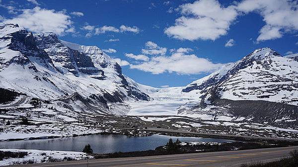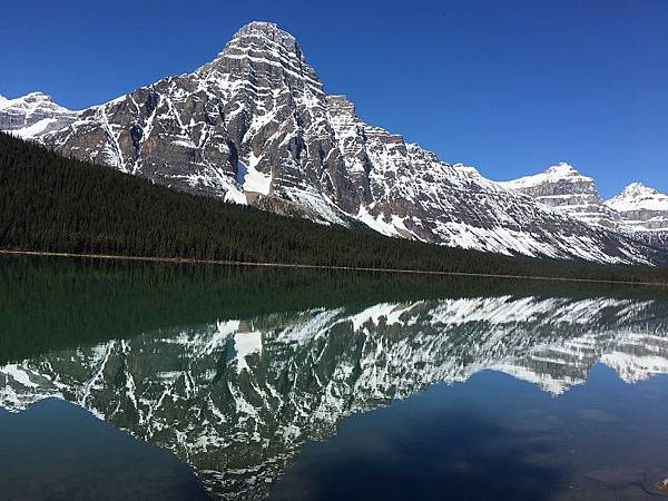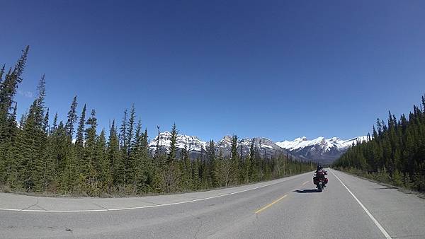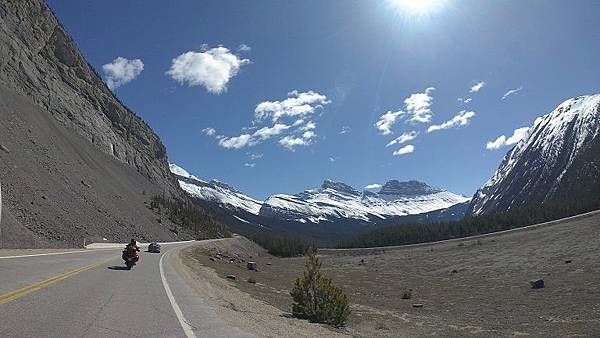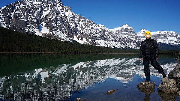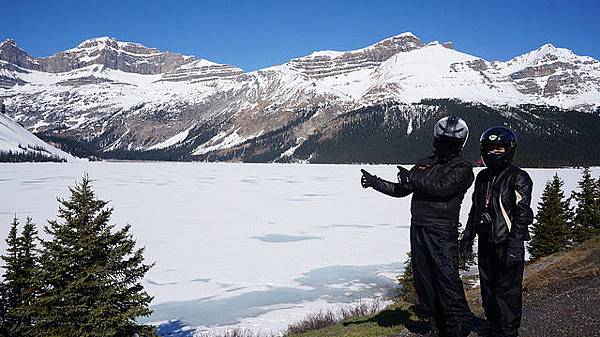 楓葉1號往北到Lake Louise就要轉入93冰原大道,很猶豫要不要再去露易絲湖補拍照,今天的太陽實在太美,可是時間有限,只好期待下次再造訪。美麗的風景總是在不經意的轉角處彌補著未能達成的遺憾,進入93沒多久就遇上Herbert Lake,光線正好將整片群山倒影在水面,攝影師狂殺記憶體,這樣的藍天湖面才是我認識的洛磯山脈。接下來遇上尚未化冰美呆了也凍呆了的Bow Lake又別有一番風味,氣溫持續在0度左右照相也捨不得將安全帽脫下,Bow Lake是比較大的景點,許多車子包含遊覽車都有會停留拍照,過了Bow Lake後我看大部分的遊覽車都轉往Bow Summit,又是一個可惜錯過的美景,聽說上面的狗頭清晰可見。接下來一路順暢到The Crossing Resort,這裡有冰原大道裡唯一的加油站與對外連接的11號公路,不知是腦袋凍壞居然算錯里程,以為可以一桶油就到Jasper(汽車一桶油沒有問題,兩台摩托車一桶油耗約在300左右),還好紅騎士機警當下立斷決定加油,但畢竟是荒郊野外的加油站,大概全AB省最貴的油就這間了吧!(本次加最便宜的居然在卡加利喔!)