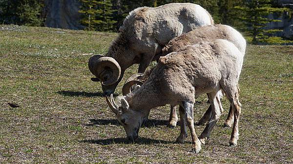 稍作休息上廁所,從93起點Lake Louise算起至Columbia icefield目前還跑不到2/3,時間很難預估,不知1點前是否到的了Columbia Icefield Discovery Centre。果真繼續前進時就遇上施工管制,路面正好在鋪柏油還好只等10多分鐘,再遇上了大角羊群拍照又多延10來分。在國家公園裡有一種塞車叫做動物引起的塞車(animal jam? wildlife traffic jam?),凡是車速突然變慢或是路邊停了很多車,則代表附近有野生動物出沒,聽說熊的塞車指數最高。