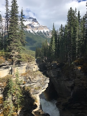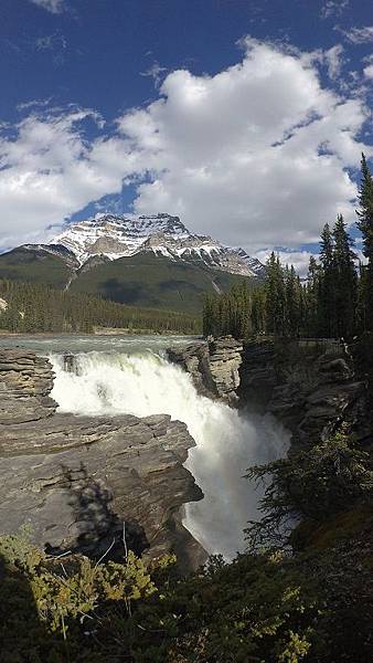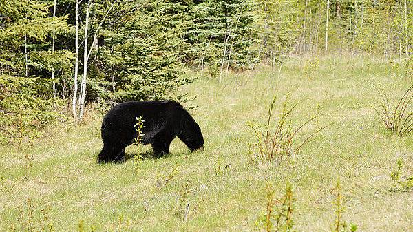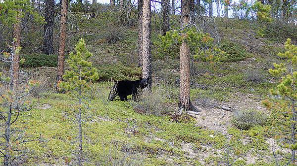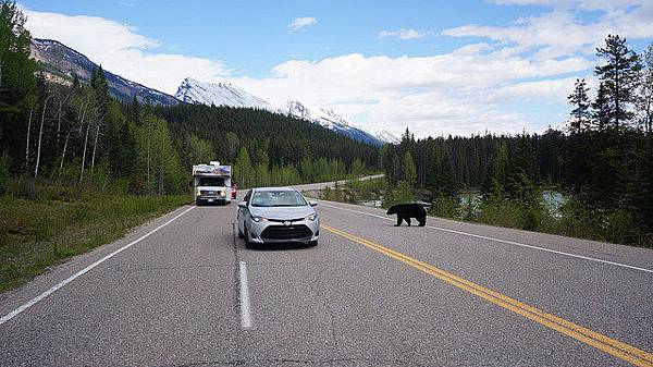 今日後續沒有另行規劃,就是天黑前抵達Jasper,沿途先停靠Sunwapta Falls,兩騎士累了不想多走還好瀑布就在停車場旁邊不遠,與前兩天的Marble Canyon景緻不會差異太大,Marble Canyon因為有雪加持感覺變得特別美麗,之後遇到的瀑布就再也贏不過他。往北途中突然車速又慢了下來,果然山頂上有隻黑熊,遠的幾乎只有一個黑點,再往前些遇到了熊過馬路,紅騎士不聽勸,跳下車追著熊跑要討拍照(非常危險請勿模仿,每年因為這樣而激怒熊攻擊人的案例不勝枚舉),我們則覺得有看到就好,不想等紅騎士所以繼續往前約在Athabasca Falls會合。往Athabasca Falls須轉往93A,離93不遠瀑布也就在路邊,若不想停車可以直接在路邊看看就好,轉進93A還有另外一個目的,想去Angel Glacier,國家公園網站指示93A在11月到隔年4月間是不開放的,我們5月底應該有機會,可惜過了Athabasca Falls的停車場後只剩碎石路,不適合我們的摩托車前進(距離有些遙遠),只好放棄回到93直達Jasper。