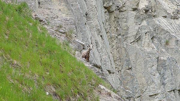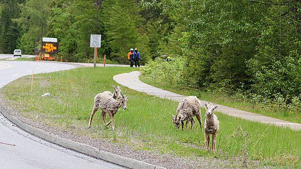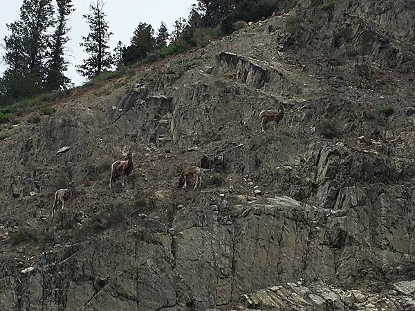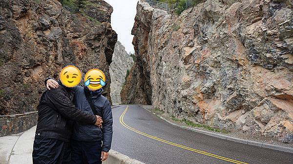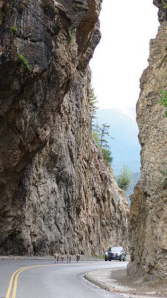 早上放棄唯一一個住宿附贈的早餐將昨晚的剩食結束,掙扎著要不要先穿雨衣,出發時雖沒下雨但空氣中瀰漫著水氣,距離第一個拍照點Sinclair Canyon只有幾百公尺,天氣不好開始後悔沒有前一天下午先去。這裡要拍的是那窄小的峽谷,最好是有大貨車經過時的對比,但今天出門意興闌珊,應該是天氣的因素,再加上山壁上的一群羊,整個讓風景失焦,混了2、30分鐘離開前,羊全跳上大街悠閒吃草,又耽誤一段時間,算了今天真的沒啥行程隨意。