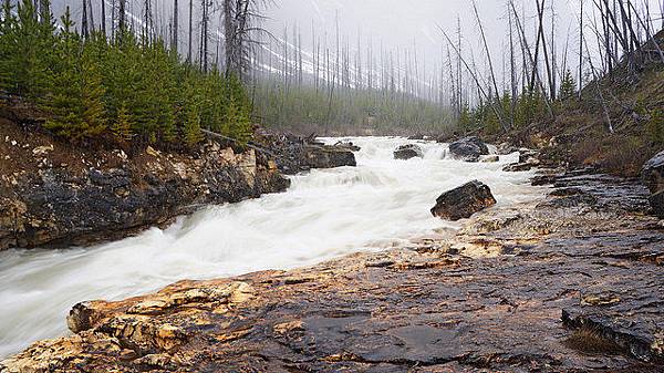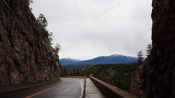 離開Sinclair Canyon天氣感覺會越來越糟,著裝整套雨衣,這次帶去的外套與保暖衣物也全上了,距離第二個拍照點Kootenay Valley Viewpoint只要再往前約15Km,這15Km從綿綿細雨到碩大雨滴再轉變成了冰霰,溫度降至2.5度。途中因前車紅騎士沒事冒著生命危險在其中一個轉彎處超車後,他們就錯過了Kootenay Valley Viewpoint。如果天氣好Kootenay Valley Viewpoint是一個可以拍出幅員遼闊感覺的好地點,居高臨下山巒相連,大器。可天氣就是不好都下霰了也不期望能看到什麼,好不容易霧稍微散些,隨手拍了幾張趕緊把手機收回口袋裡以免今天都不能用,畢竟只剩2.5度蘋果不當機也難。