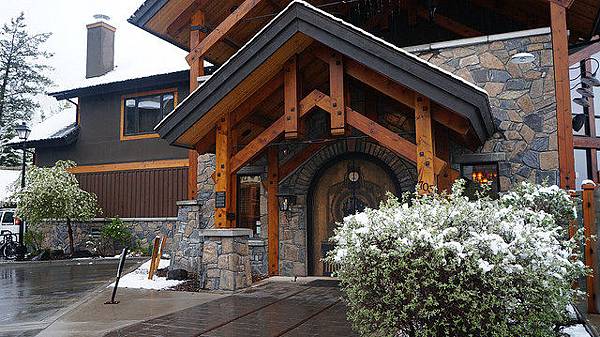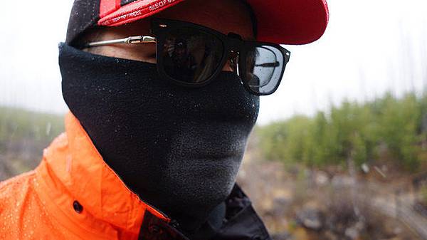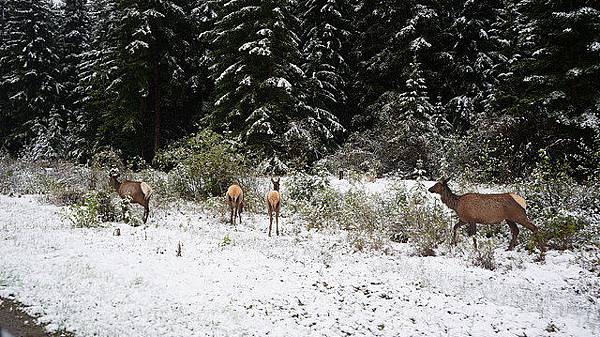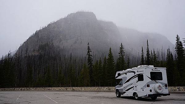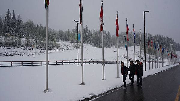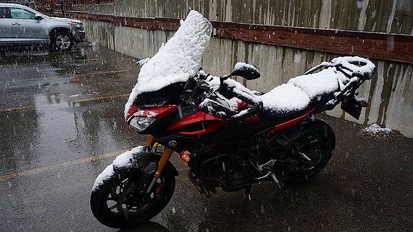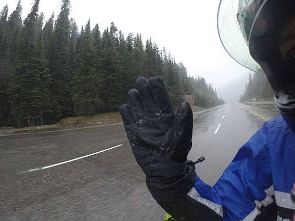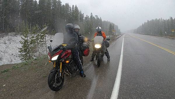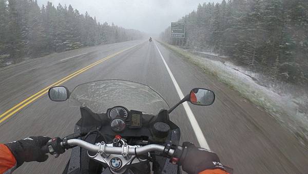 離開Marble Canyon到Canmore約72Km,就是本次最硬頸的行程了,無論前面幾天算是有多疲倦、距離有多長、甚至被警察追著跑都沒有這72Km來的難應付。回到停車場,已開始小積雪;昨天第一次在超市裡看到有賣楓糖餅乾帶著果腹、喝點熱水讓身體回溫,由93在Castle Junction接上楓葉1,在還沒上高速公路前霧與雪已經越來越大,黑騎士的眼鏡鏡片因鏡框熱漲冷縮掉了出來,迫不得已在路邊違停修眼鏡,還好是在上高速公路前發生。在93時有霧視線不好車速保持在60~70其實已經覺得很危險,上楓葉1後汽車都開在100多,我們只好靠邊慢騎但也有100,感覺這樣應該很快就會到canmore了吧。錯,騎士兩可是右手騎車左手除冰,逢休息灣得停下回溫並掃除車上人上的冰雪,就這樣撐過72Km的風雪抵達溫暖的B&B。