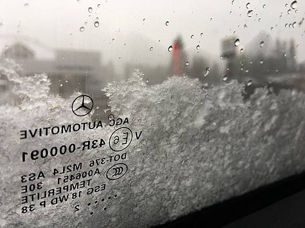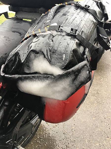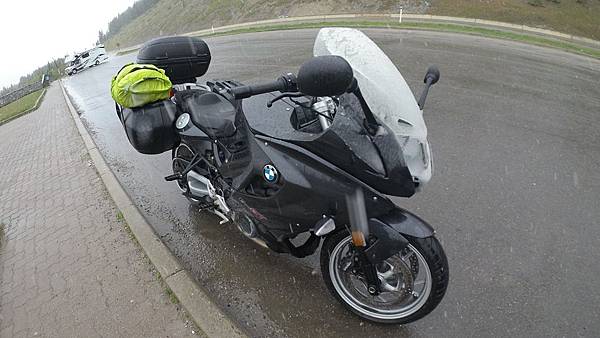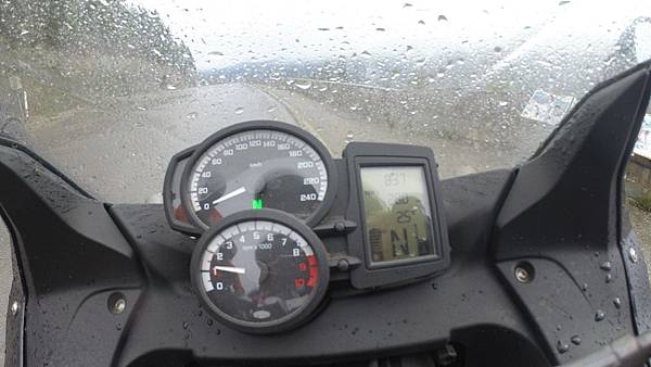 跨上車繼續前行下了這座山頭,紅騎士在路邊等著,以為我們出了什麼事,想撥電話卻沒有訊號,也不確定我們無線電有沒有開,正想回頭就出現。臭念紅騎士一頓沒良心的不怕死天雨路滑還敢超車,錯過美景活該(其實好像沒停沒差)。沿路上天氣時好時壞偶爾下下雨,但感覺雨長得越來越怪不像滴的像飄的,原來不是霰是雪阿!