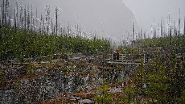 抵達Marble Canyon停車場,尿急使用了本行程第一次的環保廁所,很棒!因為剛抽完水肥乾淨的不得了。網路上查過,在93號路上這條步道算是平易近人風景優美,剛好季節也不算旺季沒有很多旅客,停車場上只有一台露營車。下雪怕路滑放棄換上球鞋,靴子直接上陣,還好有帶著登山杖補足我腳的不便(但也只用了這一次),雨衣雨褲沒脫,第一怕冷第二怕接下來天氣更糟,果真隨著時間越晚雪越大,入山時還很興奮的玩起吃雪的蠢事(不方便放照片),回程大雪紛飛被雪吃。在Marble Canyon首次遇到紅椅子,據說有椅的地方是最美的風景,下雪天沒人搶登高一坐,好風景見仁見智就不浪費相機電力。